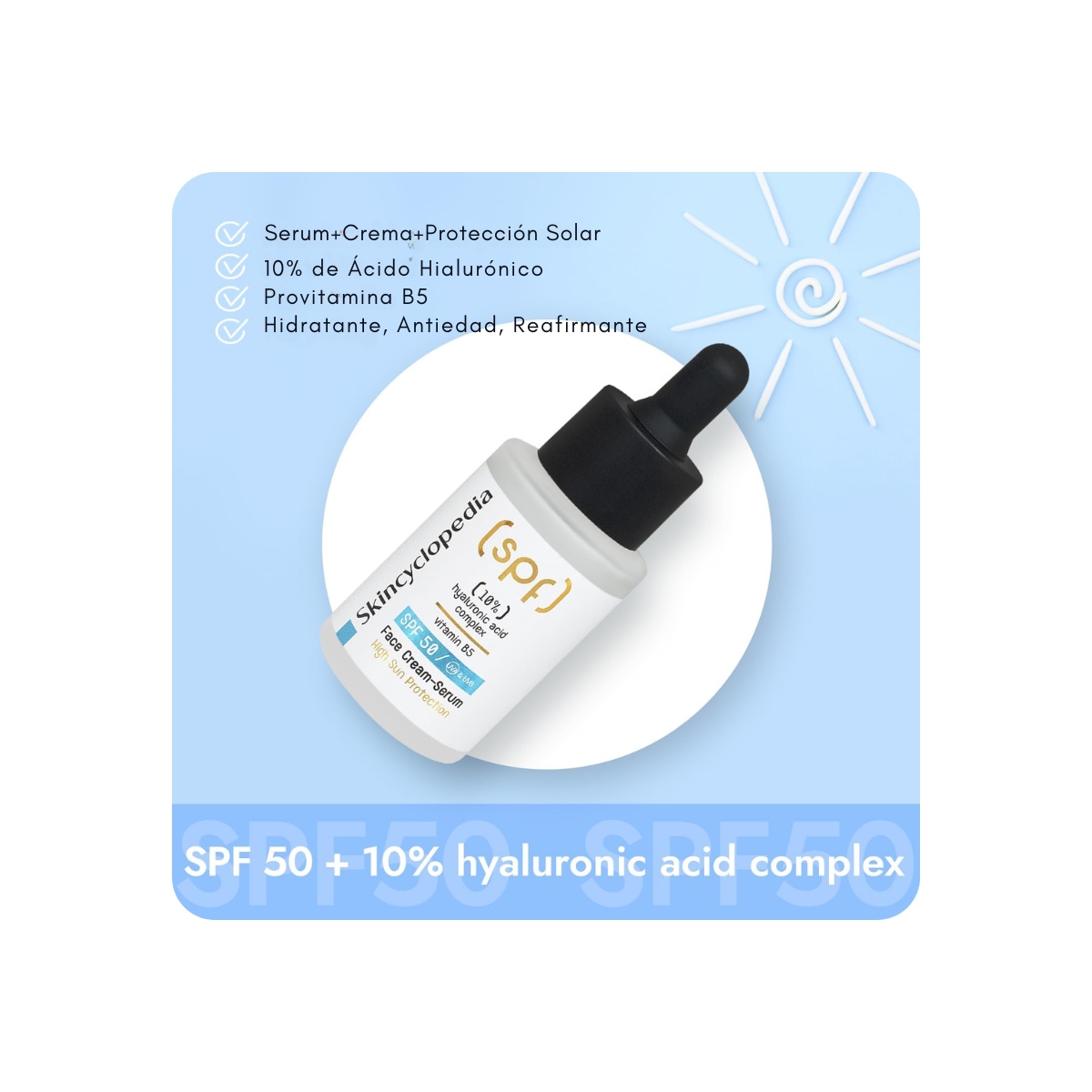 💧Skincyclopedia 10% Hyaluronic Acid Complex, tratamiento Hidratante, Antiedad y Protección solar alta